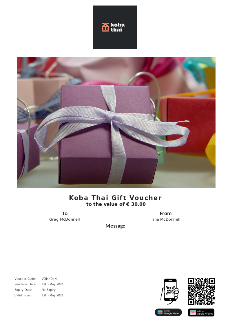 Koba Thai allows you to purchase instantly printable gift vouchers, special offers and tickets using the Voucher Connect platform.
